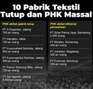 Kementerian Perindustrian juga melaporkan enam pabrik besar telah tutup hingga Juni 2024, yakni PT Dupantex, PT Kusumahadi Santosa, PT Kusuma Putra Santosa, PT Pamor Spinning Mills, PT Sai Aparel di Jawa Tengah, serta PT Alenatex di Jawa Barat, dengan total 11.000 buruh terkena PHK.