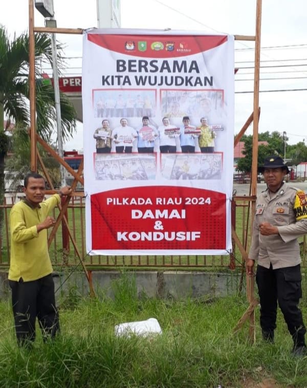 LakiNews|Dumai, —– Dalam rangka mendukung terciptanya suasana kondusif menjelang Pemilihan Kepala Daerah (Pilkada) Riau 2024, pihak Polres Dumai berserta jajaran Polsek  pasang beberapa baliho dan spanduk bertuliskan “Bersama Kita Wujudkan Pilkada Riau 2024 Damai dan Kondusif”.