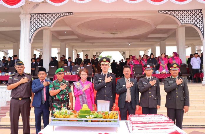 LakiNews|Rokan Hilir, — Dalam rangka memperingati Hari Ulang Tahun (HUT) Bhayangkara ke- 78 Tahun 2024. Polres Rokan Hilir menggelar upacara bersama dihadiri jajaran Forkopimda Rokan Hilir dan sejumlah element masyarakat dilaksanakan di Lapangan MTQ Batu 6 di Bagansiapiapi, Senin (1/7/2024) sekitar pukul 08.00 WIB.