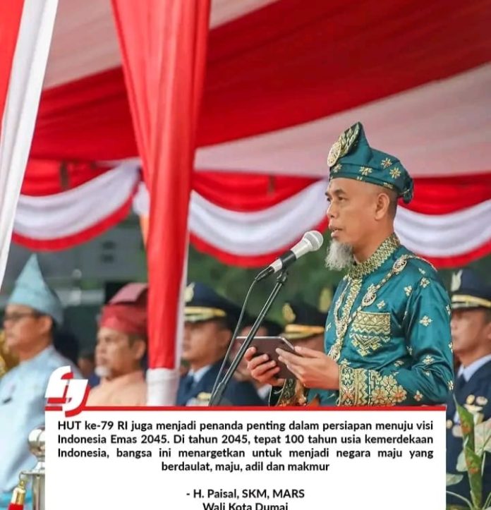 “HUT ke-79 RI juga menjadi penanda penting dalam persiapan menuju visi Indonesia Emas 2045. Di tahun 2045, tepat 100 tahun usia kemerdekaan Indonesia, bangsa ini menargetkan untuk menjadi negara maju yang berdaulat, maju, adil dan makmur” ujar Wako Paisal.