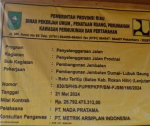” Tahun lalu, maksud saya tahun 2024 lalu proyek tersebut dikerjakan oleh oleh PT.Nada Pratama dengan nomor kontrak 630/SPHS-PUPRPKPP/BM-PJSM/166/2024, tanggal 21 Mei 2024, dengan nilai kontrak Rp.25.792.475.312.00 milyar, masa pelaksanaannya 225 hari kalender, konsultan pengawasnya PT. METRIK ARSIPLAN INDONESIA.” Ujar Pengurus LSM Gempur bernama H Arif itu Kamis ( 09/01/2025 ) tadi